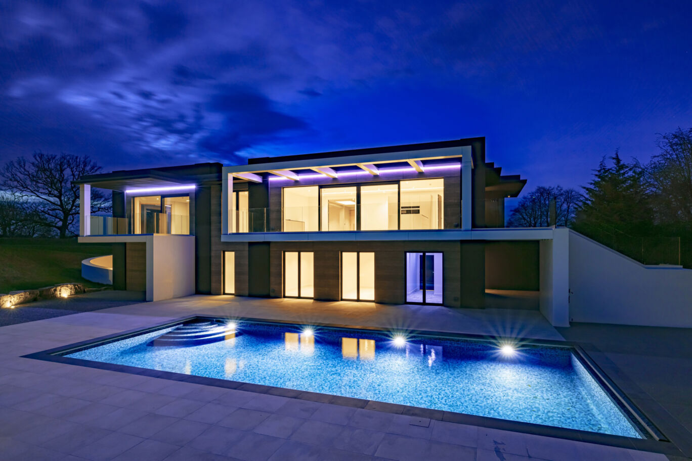 The house is embraced within lawned terraces which lead to a forecourt at the entrance and a stunning pool area to the rear. The balconies with their glazed balustrades, along with cantilevered elevations and projections, bring together crisp angles and sweeping curves using a limited palette of superior materials to create a contemporary home which exudes a feeling of chic modernity.